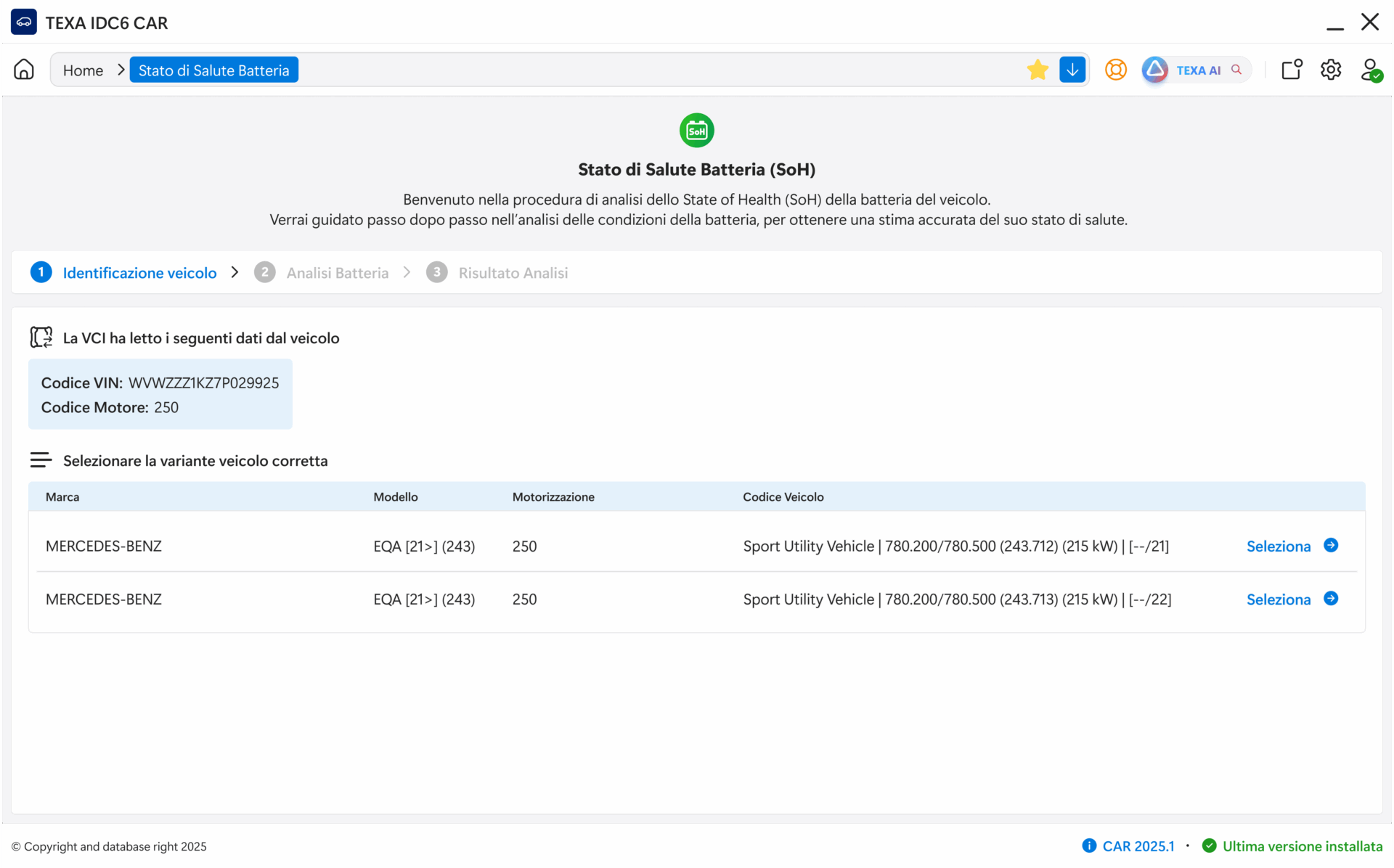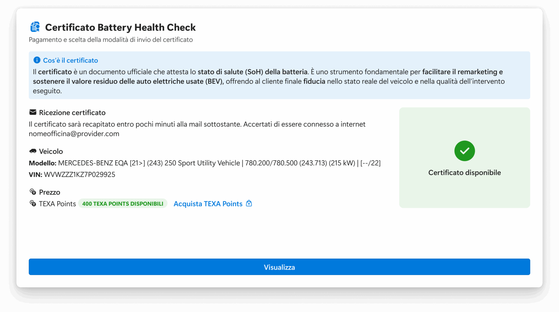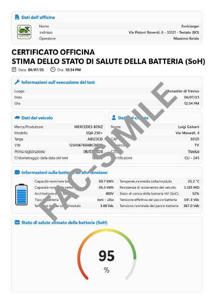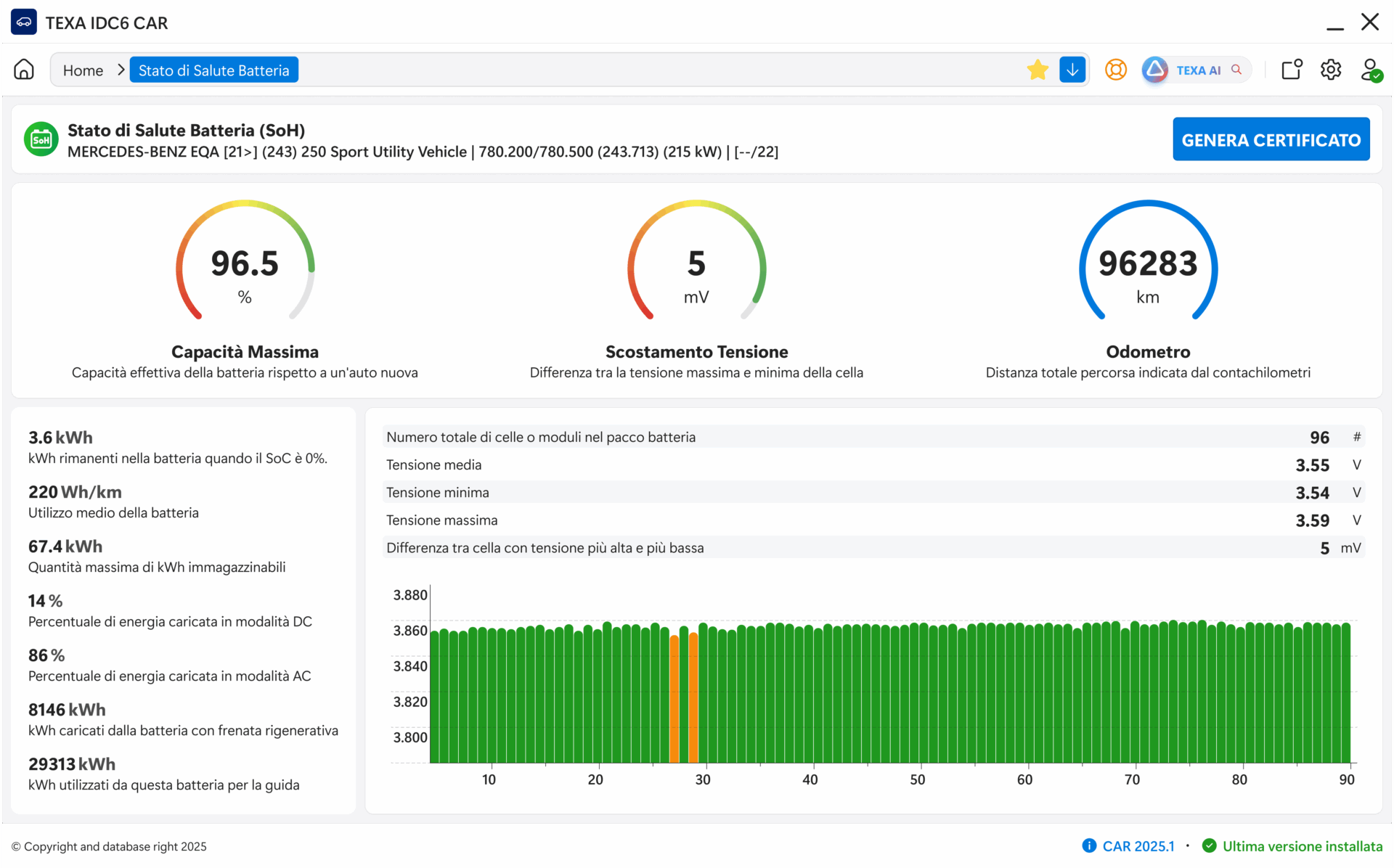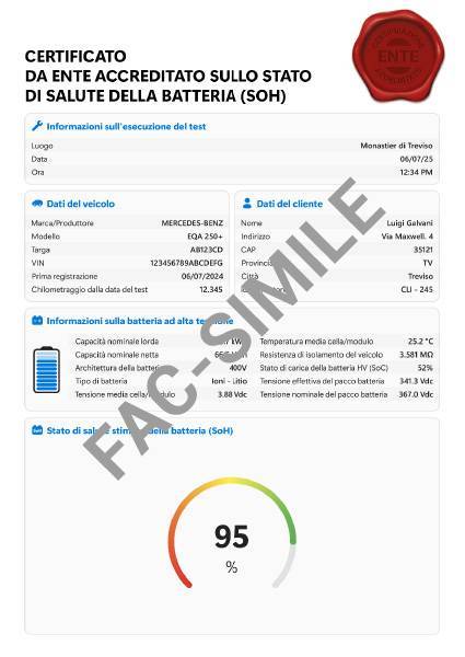 Dans cette optique, TEXA a développé un processus qui, grâce aux paramètres obtenus directement des calculateurs et à leur traitement ultérieur dans le cloud, fournit une estimation précise, basée sur le pourcentage, de l’état de santé de la batterie (State Of Health). Ce processus est de série sur l’E-DIAG CHARGER. De plus, le mécanicien qui souhaite fournir au client un certificat accrédité sur l’état de santé de la batterie peut le demander directement à partir de La station et le recevra en quelques minutes sur son adresse électronique.